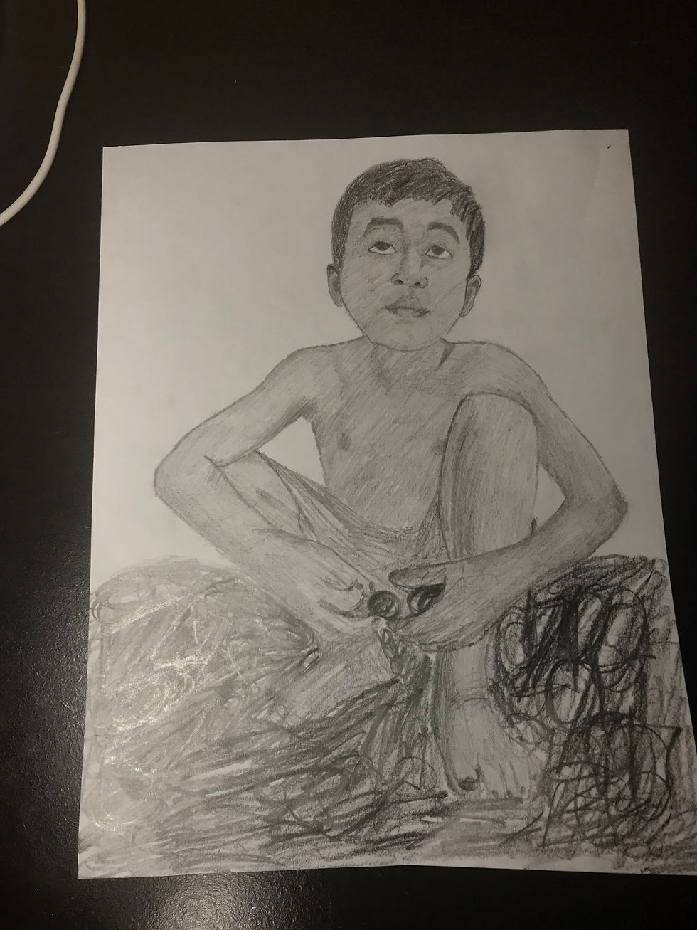 In this artwork, you can see a child searching for food over a mountain of trash. This is something over 180 million kids around the world are doing everyday, fighting with hunger, searching for food in landfills hoping they would have enough to just survive.